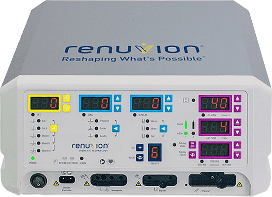 O Renuvion é uma tecnologia avançada utilizada para procedimentos de retração da pele; combina a energia do plasma frio com a radiofrequência para fornecer uma contração significativa do tecido durante procedimentos cirúrgicos ou minimamente invasivos.